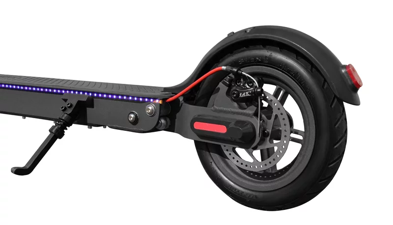 Катайтесь в любое время суток и чувствуйте себя уверенно. Задний дисковый тормоз срабатывает быстро и мгновенно останавливает электросамокат, что способствует безопасному вождению. Передняя LED-фара дает достаточно света для езды при слабом освещении, а подсветка под декой и задний стоп-сигнал помогают сделать транспорт более заметным на дороге для пешеходов и водителей.
